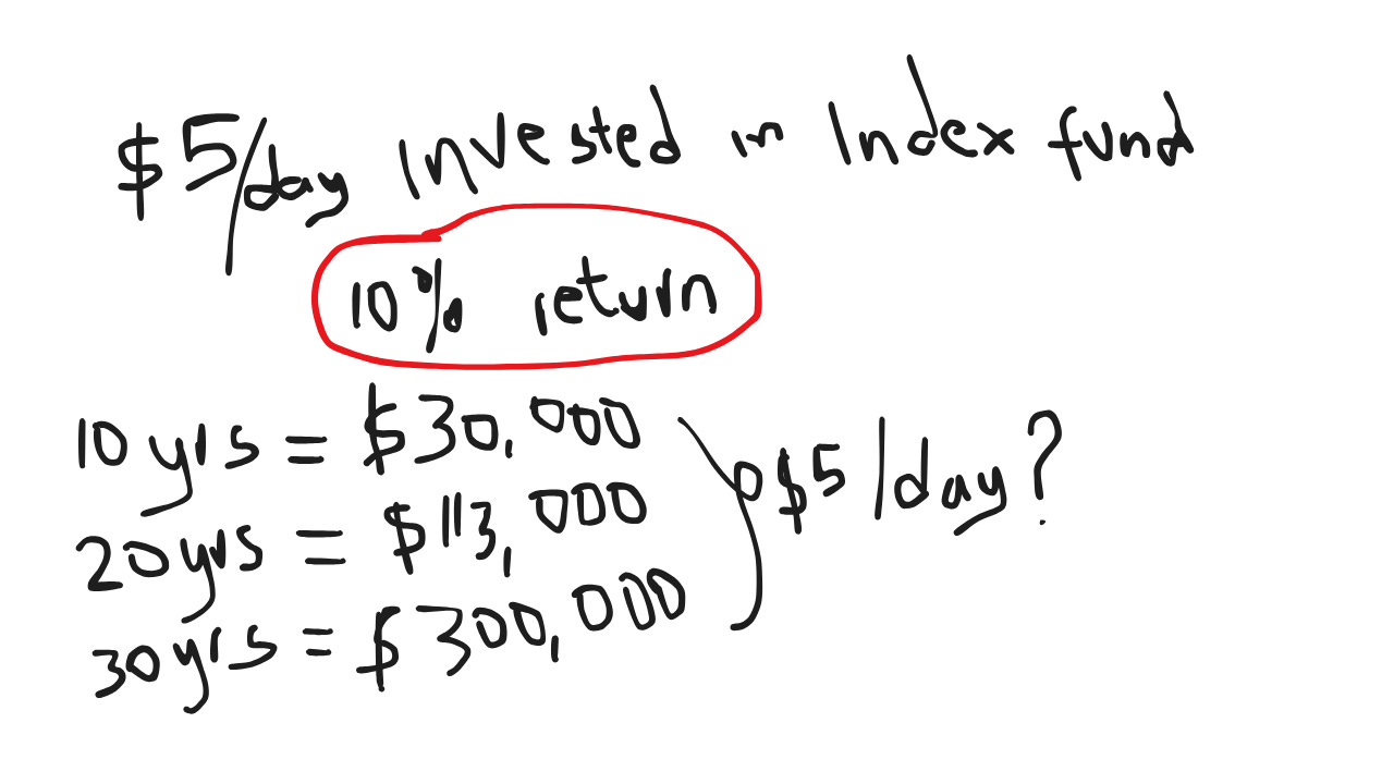 If you invest just $5 a day (about $150 a month) in an index fund averaging 10% annual returns (historically, the S&P 500 has done even better):